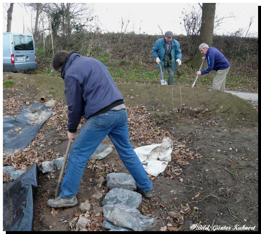Aufschüttung des Steinwalles und Bepflanzung des ganzen Biotops. Die Feuerwehr,